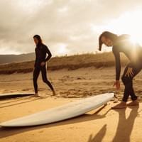 海での知識からはじまり道具の説明、波へ乗るためのレクチャーを行い、実際にインストラクターと海へ入り、波に乗りボードの上に立つまでの過程を丁寧にレッスン致します。